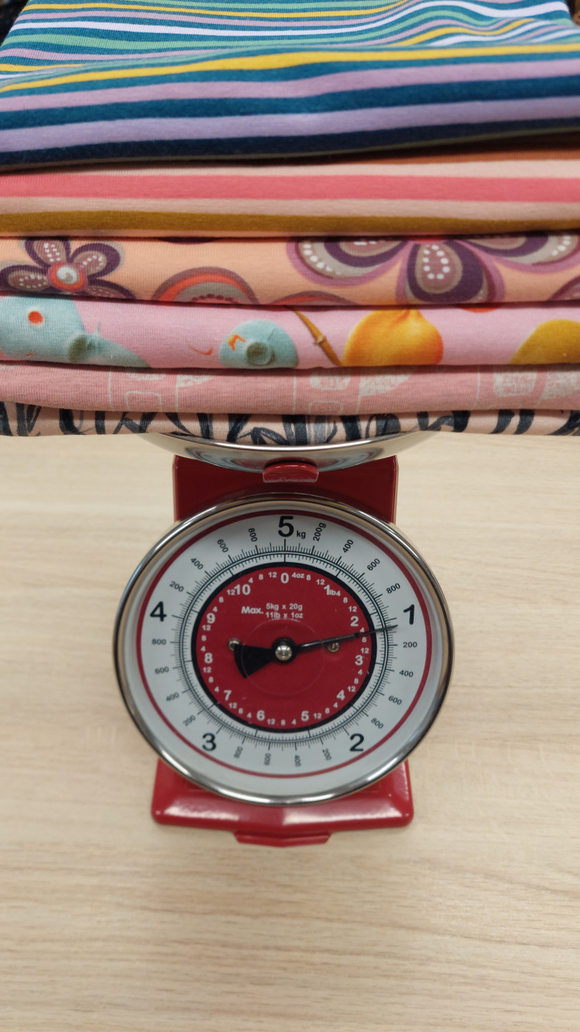 Blago na kilogram, različnih barv, širin in vzorcev pakirano po teži. V enem kilogramu je približno 3 tekoče metre blaga.